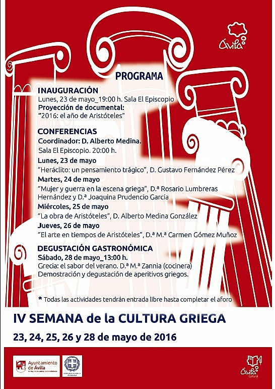 Por si consideran de interés la difusión de esta iniciativa, adjunto les envío el cartel de la IV Semana de la Cultura Griega que, promovida por el profesor Dr. Alberto Medina Glez. y en colaboración con el Ayuntamiento y la Embajada de Grecia, se celebrará en Ávila del 23 al 28 de mayo.