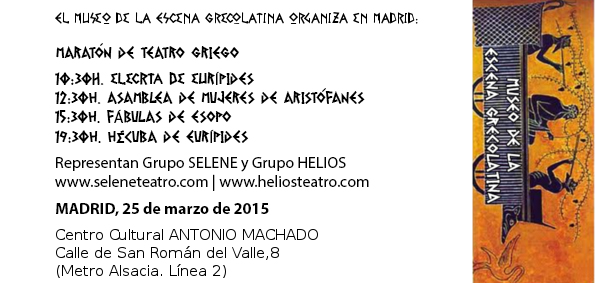 El Museo de la Escena Grecolatina organiza en Madrid, coincidiendo con el día de la Fiesta Nacional en Grecia, una Maratón de Teatro Griego que permitirá a los alumnos, profesores y público en general, degustar los textos de los trágicos y cómicos en una sola jornada.