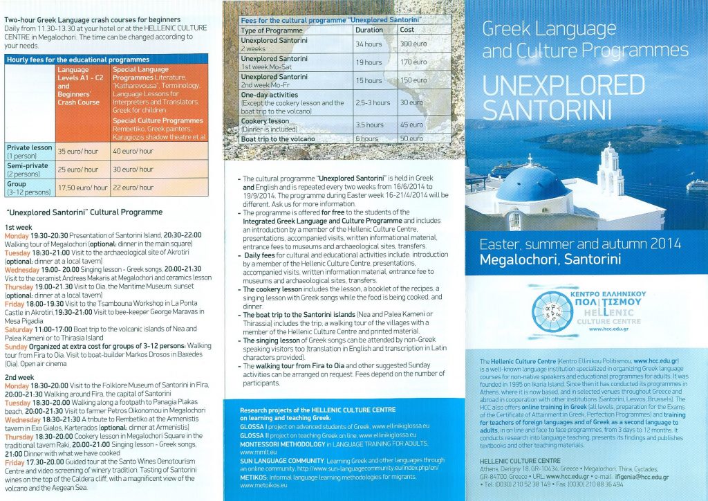 Tenemos el gusto de facilitarles información sobre los diferentes programas educativos y de enseñanza del griego actual organizados del Hellenic Cultural Centre, el verano de 2014 en la isla de Santorini.