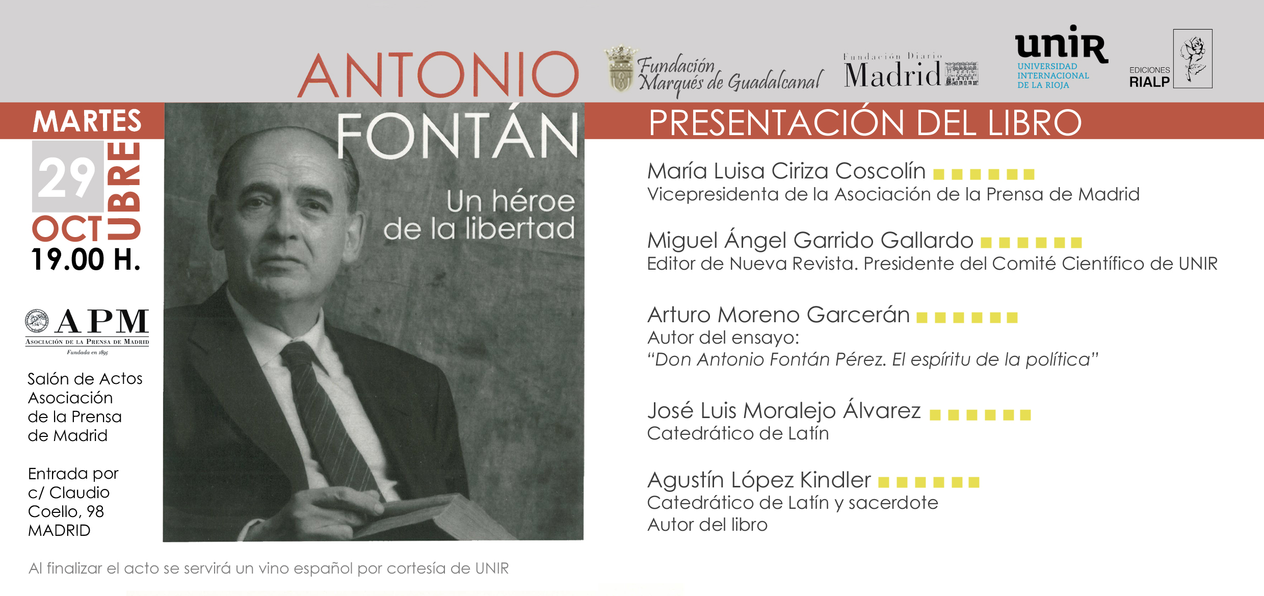 El día 29 de octubre, a las 19.00h se presenta el libro Antonio Fontán, un héroe de la libertad, de Agustín López-Kindler, en la Asociación de la Prensa de Madrid (c/ Claudio Coello, 98).